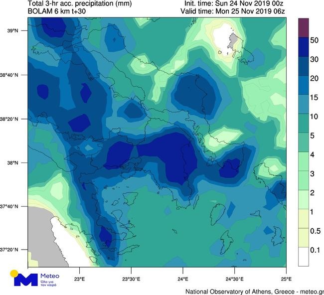 Ισχυρές βροχές και καταιγίδες θα εκδηλωθούν στο νομό Αττικής και στην πόλη της Αθήνας από τις πρώτες πρωινές ώρες έως και το μεσημέρι της Δευτέρας 25/11, όπως φαίνεται και στο χάρτη που ακολουθεί.