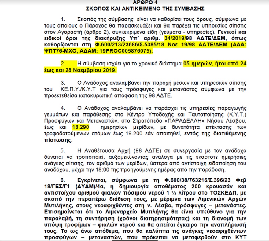 Αξίζει να σημειωθεί ότι στη σύμβαση υπάρχει και η πρόβλεψη της δυνατότητας επέκτασης των τροφοδοτούμενων ατόμων έως 19.200 για το διάστημα μεταξύ 24 έως και 20 Νοεμβρίου. Στοιχείο που αναδεικνύει πόσο «εκρηκτική» είναι η κατάσταση στο Κέντρο Υποδοχής και Ταυτοποίησης.