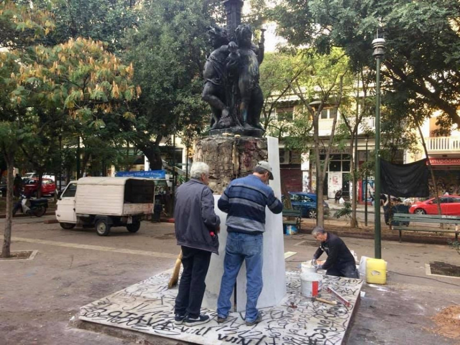 Στην πλατεία Εξαρχείων τοποθετήθηκαν νέα μάρμαρα στο άγαλμα που βρίσκεται στο κέντρο έτσι ώστε να επανέλθει στη μορφή που είχε πριν βανδαλιστεί.
