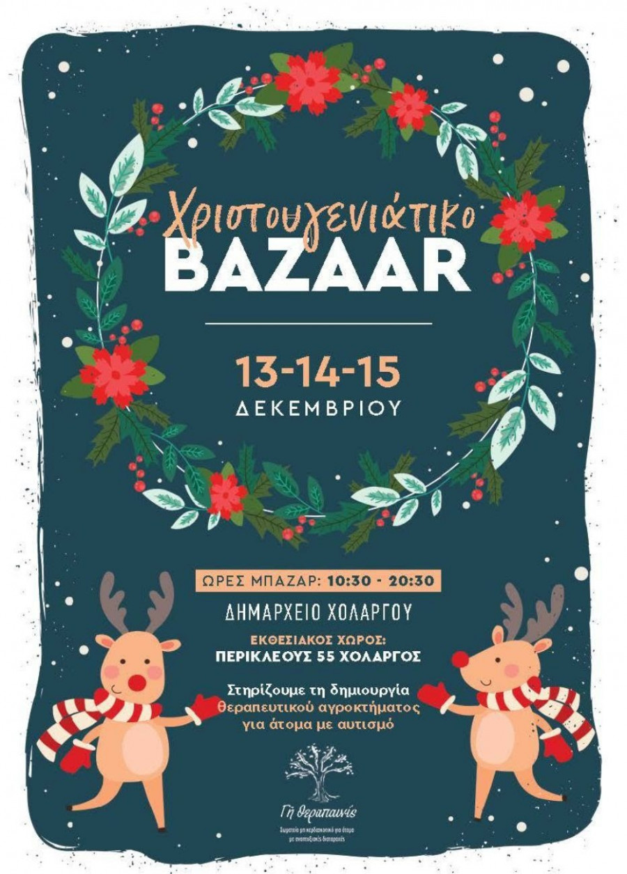 Για την ενίσχυση του κηπουρικού της προγράμματος η Γη Θεραπαινίς οργανώνει Χριστουγεννιάτικο μπαζάρ 13, 14 και 15 Δεκεμβρίου στο Δημαρχείο Χολαργού (Εκθεσιακός χώρος Περικλεούς 55) και καλεί τους φίλους της να στηρίξουν την προσπάθεια.