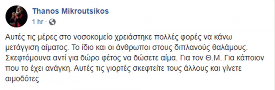 Πριν από λίγες ημέρες, είχε στείλει ένα ξεχωριστό μήνυμα προς όλους τους φίλους του, μέσω των social media, ενώ νοσηλευόταν σε ιδιωτικό θεραπευτήριο: