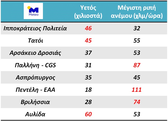 Αξίζει να σημειωθεί ότι στην Πεντέλη η μέγιστη ριπή που καταγράφηκε έφτασε τα 111 χλμ/ώρα.
