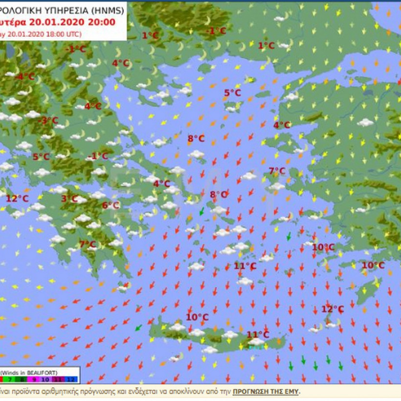 Ανεμοι: Βόρειοι 4 με 6 και στα ανατολικά τοπικά 7 μποφόρ.