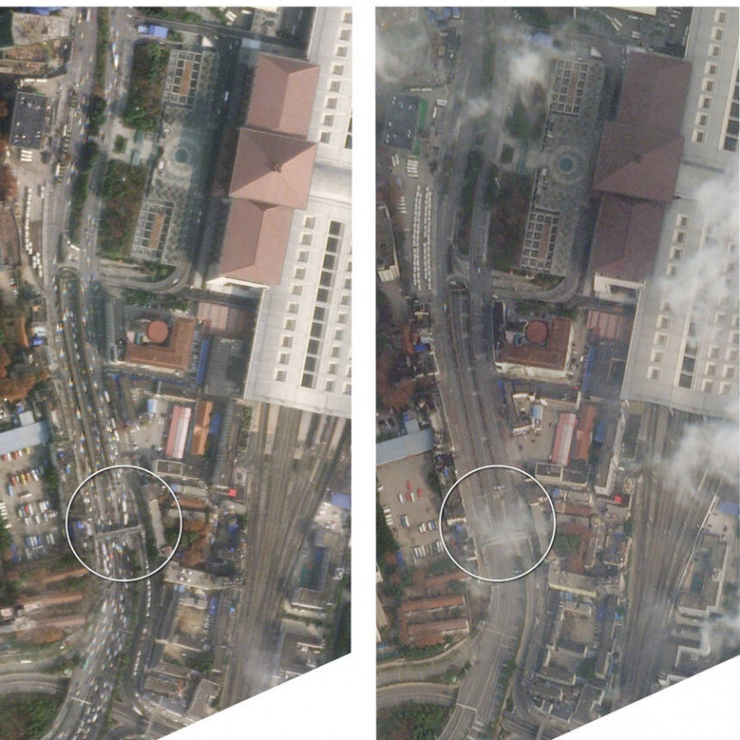 Η φωτογραφία που τραβήχτηκε στις 28 Ιανουαρίου δείχνει μια μεγάλη γέφυρα στον ποταμό Γιανγκτσέ έρημη από αυτοκίνητα, ενώ σε αντίστοιχη εικόνα της 12ης Ιανουαρίου το πέρασμα αυτό φαίνεται γεμάτο με αυτοκίνητα. Η μεταγενέστερη εικόνα αποκαλύπτει επίσης την απουσία σταθμευμένων οχημάτων στους γειτονικούς δρόμους. Λείπουν ακόμα και τα πλοία που φαίνονταν προηγουμένως στα θολά νερά του Γιανγκτσέ.