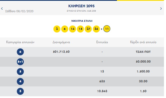 Πραγματοποιήθηκε η κλήρωση του ΛΟΤΤΟ (2095) που μοιράζει περισσότερες από 500.000 ευρώ στους τυχερούς της πρώτης κατηγορίας.