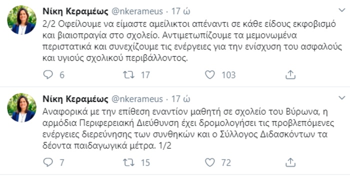 «Είμαστε αμείλικτοι απέναντι σε κάθε είδους εκφοβισμό και βιαιοπραγία στο σχολείο» αναφέρει η υπουργός σε tweet: