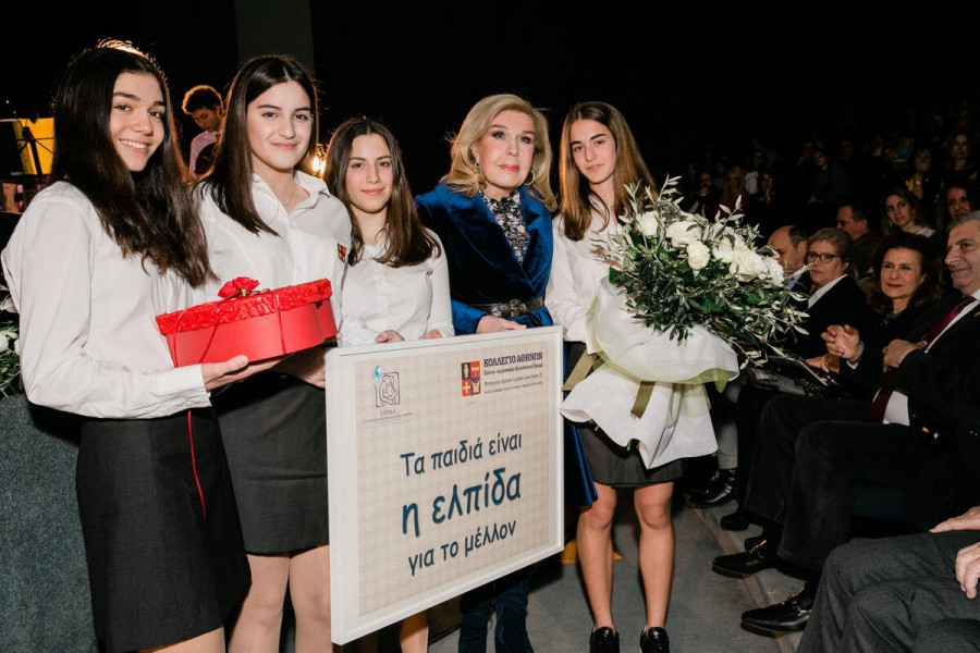 Ιδιαίτερα συγκινητική ήταν η στιγμή που μαθήτριες του Κολλεγίου Αθηνών προσέφεραν στην κυρία Βαρδινογιάννη ένα συμβολικό αναμνηστικό δώρο, για να της θυμίζει πάντοτε τη συμπαράσταση της νέας γενιάς.