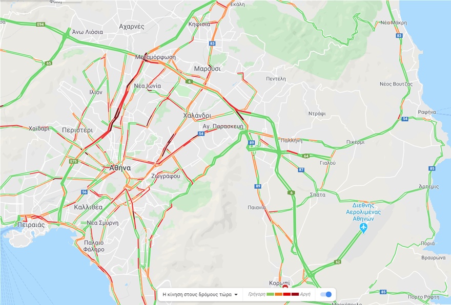 Αυξημένη κυκλοφορία παρατηρείται και στα δύο ρεύματα του Κηφισού, τμηματικά, στην άνοδο της λεωφόρου Αλεξάνδρας, στην κάθοδο της Μεσογείων από το ύψος της Κατεχάκη και στην Ηλιουπόλεως από τη Δάφνη μέχρι τη Γυμναστική Ακαδημία.