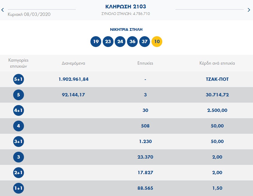 Αξίζει να σημειωθεί ότι στην δεύτερη κατηγορία (5αρια) βρέθηκαν τρία επιτυχημένα δελτία που κερδίζουν από 30.714,72 ευρώ το κάθε ένα.