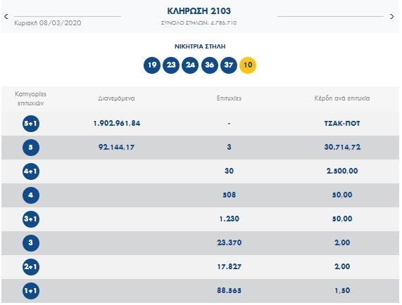 Υπενθυμίζεται ότι οι τυχεροί αριθμοί που αναδείχθηκαν στην περασμένη κλήρωση του Τζόκερ ήταν οι: 19, 23, 24, 36, 37 και Τζόκερ το 10.