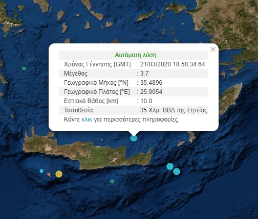 Σεισμός τώρα - Ειδήσεις: Σεισμική δόνηση μεγέθους 3,7 Ρίχτερ, σύμφωνα με το Γεωδυναμικό Ινστιτούτο του Αστεροσκοπείου Αθηνών, καταγράφηκε λίγο πριν τις 9.00 το βράδυ του Σαββάτου στην Κρήτη.