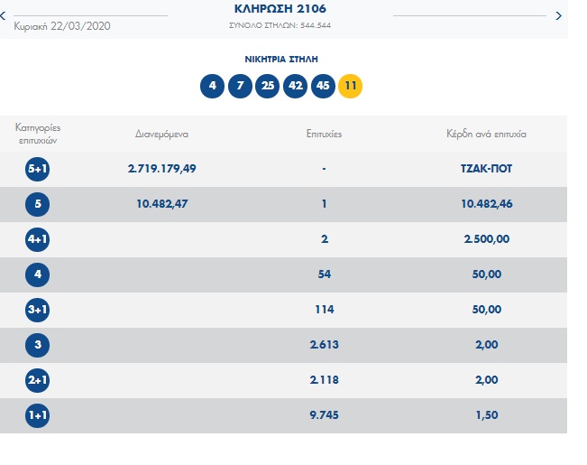 Υπενθυμίζεται ότι οι τυχεροί αριθμοί που ανέδειξε η περασμένη κλήρωση του Τζόκερ ήταν οι: 4, 7, 25, 42, 45 και Τζόκερ το 11.