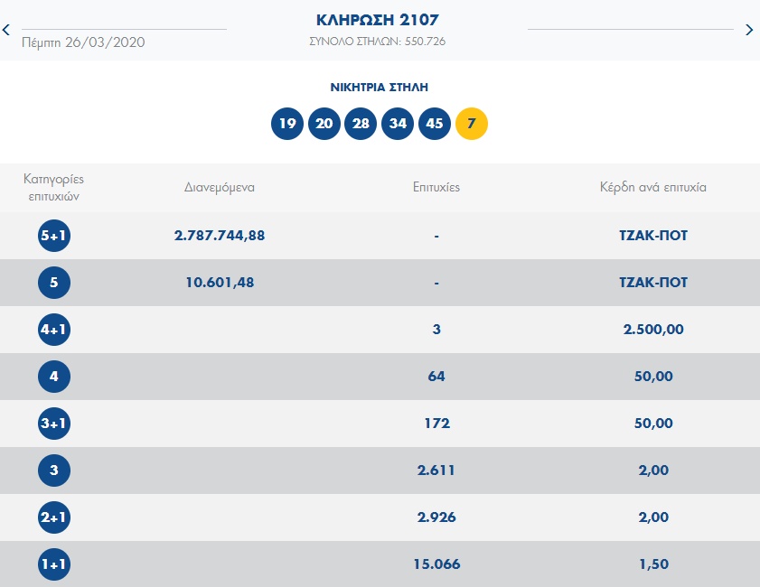 Οι τυχεροί αριθμοί που ανέδειξε η αποψινή κλήρωση του Τζόκερ είναι οι: 19, 20, 28, 34, 45 και Τζόκερ το 7.