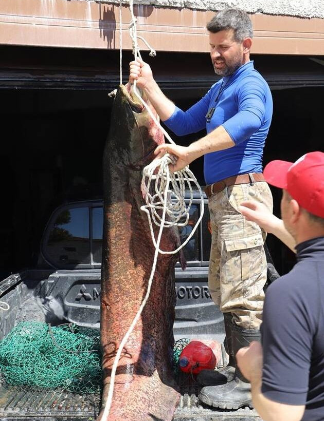 Τα δύο αδέρφια, ο Χάρης και ο Μάρκος Μπουντιός, μέλη του Συλλόγου Επαγγελματιών Αλιέων της λίμνης, είδαν ένα… τέρας 2 μέτρων και 33 εκατοστών στην ψαριά της ημέρας!