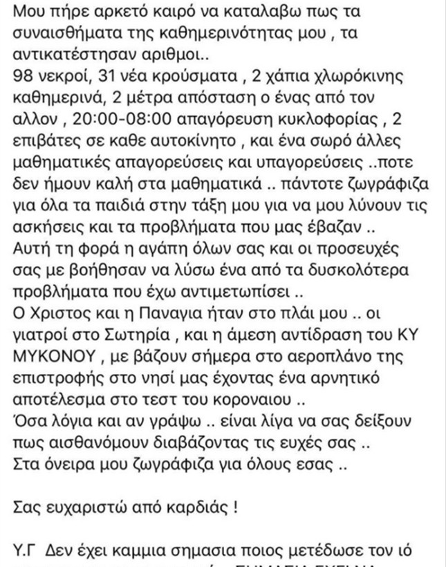 Η αγιογράφος ήταν το δεύτερο κρούσμα στο νησί των Κυκλάδων. Μέσα από την προσωπική της σελίδα στο facebook, ευχαρίστησε τους γιατρούς, τους νοσηλευτές, αλλά και όλο τον κόσμο που στάθηκε στο πλευρό της και της έστελνε μηνύματα αγάπης και στήριξης.