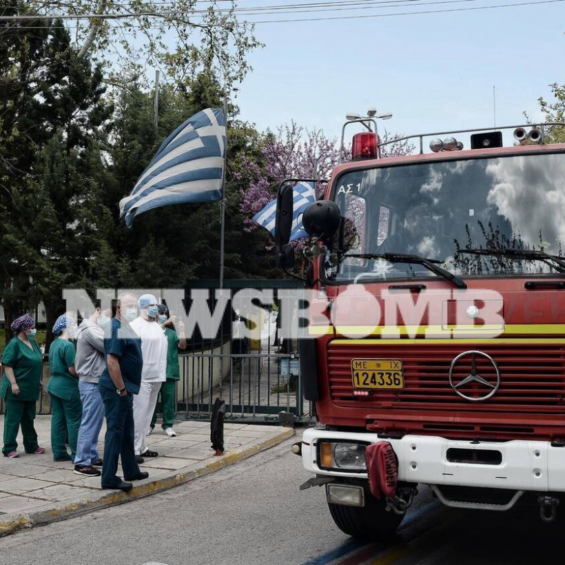 Συγκεντρώθηκαν στον προαύλιο χώρο του νοσοκομείου με τα πυροσβεστικά τους οχήματα, ενεργοποίησαν τις σειρήνες και ξέσπασαν σε χειροκροτήματα για να τιμήσουν τους ήρωες με τις λευκές και πράσινες μπλούζες.