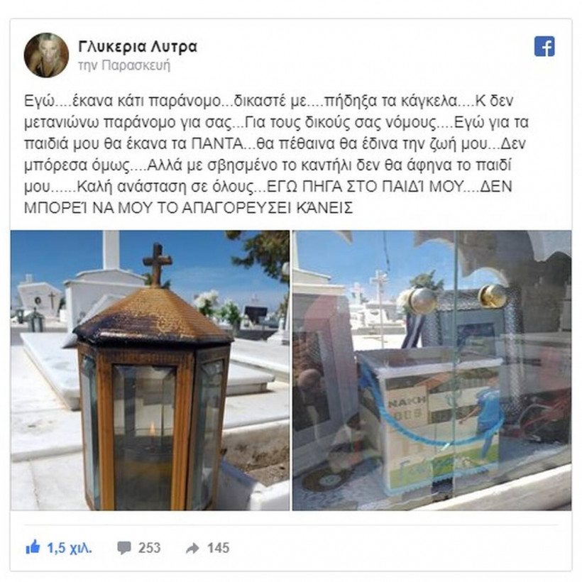 Μπορεί τα νεκροταφεία να είναι κλειστά λόγω των μέτρων για την πρόληψη εξάπλωσης του κορωνοϊού που ανακοίνωσε ο υφυπουργός Πολιτικής Προστασίας κ. Χαρδαλιάς, ωστόσο η κ. Γλυκερία Λύτρα που κατάγεται από το Πελόπιο Αρχαίας Ολυμπίας και διαμένει τα τελευταία χρόνια στην Πάτρα, βρήκε τον τρόπο να βρεθεί την Μ. Παρασκευή δίπλα στο παιδί της.