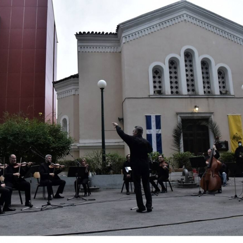 Η ορχήστρα έπαιξε έργα του Κωστή Χατζιδάκι και του Μίκη Θεοδωράκη, λέγοντας ένα ελάχιστο «ευχαριστώ» στους χιλιάδες γιατρούς και τους νοσηλευτές που δίνουν τη γενναία μάχη εναντίον του κορωνοϊού.