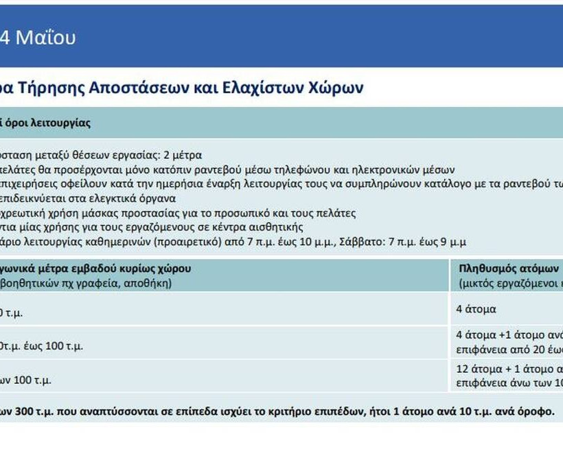 Όσον αφορά στην τήρηση των αποστάσεων στις επιχειρήσεις που θα επαναλειτουργήσουν αυτά έχουν ως εξής: Στις επιχειρήσεις λιανικού εμπορίου έως 20 τ.μ. 4 άτομα, από 20 τ.μ. – 100 τ.μ. 4 άτομα + 1 άτομο / 10 τ.μ. και άνω των 100 τ.μ. 12 άτομα + 1/ 15 τ.μ.