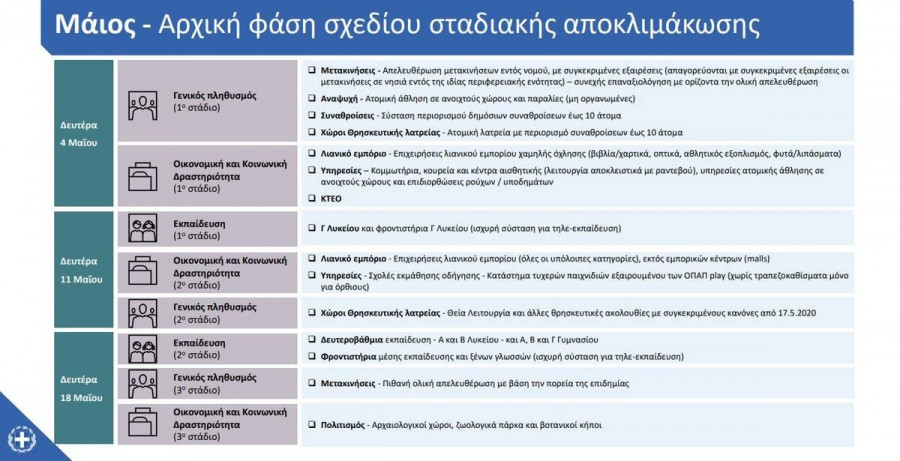 Στις 11 Μαΐου, επανεκτιμούν όλες οι υπόλοιπες επιχειρήσεις του λιανικού εμπορείου με κανόνες ασφαλείας όπως αποστάσεις ασφαλείας, χρήση μάσκας κλπ. Επίσης θα επανεκκινήσουν και οι σχολές οδηγών εκείνη την ημέρα.