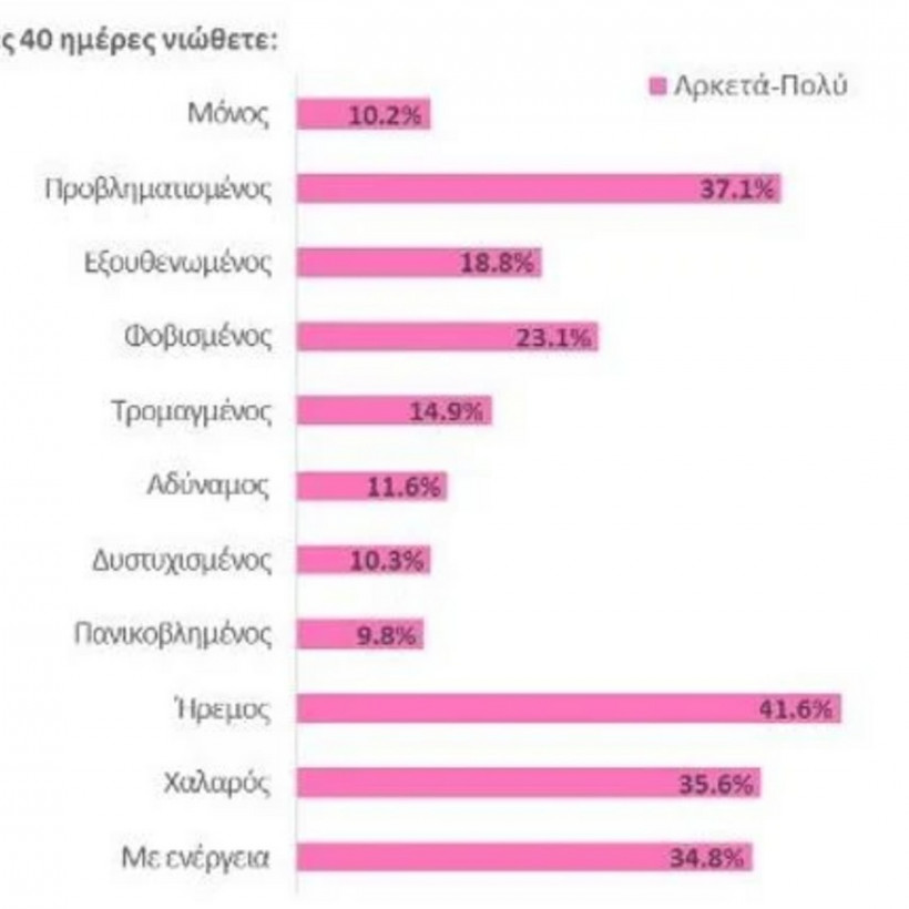 Ποικίλλες ήταν οι απαντήσεις που δόθηκαν στην έρευνα και στο ερώτημα «πώς νιώθετε τις τελευταίες 40 ημέρες», με αρκετούς να δηλώνουν ψύχραιμοι, άλλοι προβληματισμένοι και φοβισμένοι: