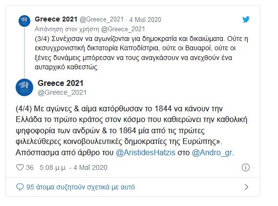 Ειδικότερα, επρόκειτο για tweets του Greece 2021, τα οποία παρέπεμπαν σε άρθρο του καθηγητή Αριστείδη Χατζή, μέλους της Επιτροπής, ο οποίος χαρακτήριζε τον Ιωάννη Καποδίστρια -τον πρώτο κυβερνήτη της Ελλάδας- δικτάτορα.