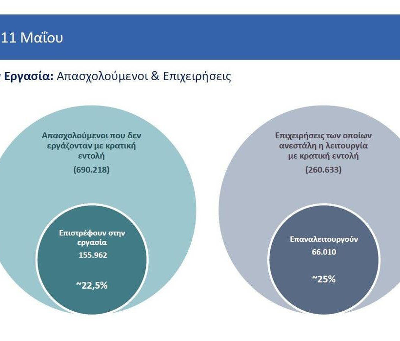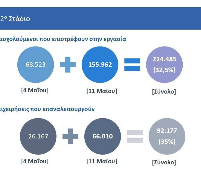 Επομένως, την Δευτέρα 11 Μαΐου, στο δεύτερο στάδιο δηλαδή της επανεκκίνησης της οικονομίας, επανέρχονται στην εργασία τους 155.962 εργαζόμενοι, δηλαδή το 22,5% των εργαζομένων που ετέθησαν σε αναστολή λόγω μη λειτουργίας των επιχειρήσεων τους. Επίσης, επαναλειτουργούν 66.010 επιχειρήσεις, δηλαδή το 25% των επιχειρήσεων των οποίων ανεστάλη η λειτουργία τους.
