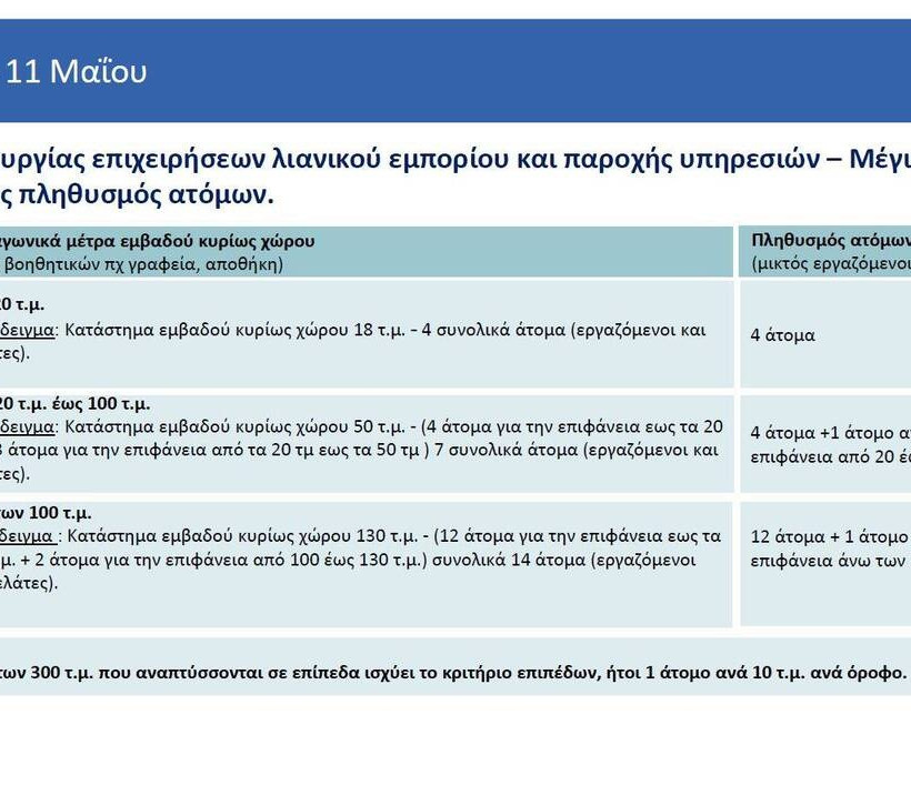 Για τις επιχειρήσεις Λιανικού εμπορίου ο μέγιστος επιτρεπόμενος αριθμός ατόμων (εργαζόμενοι και πελάτες ) εντός του κυρίως χώρου υπολογίζεται ως εξής: