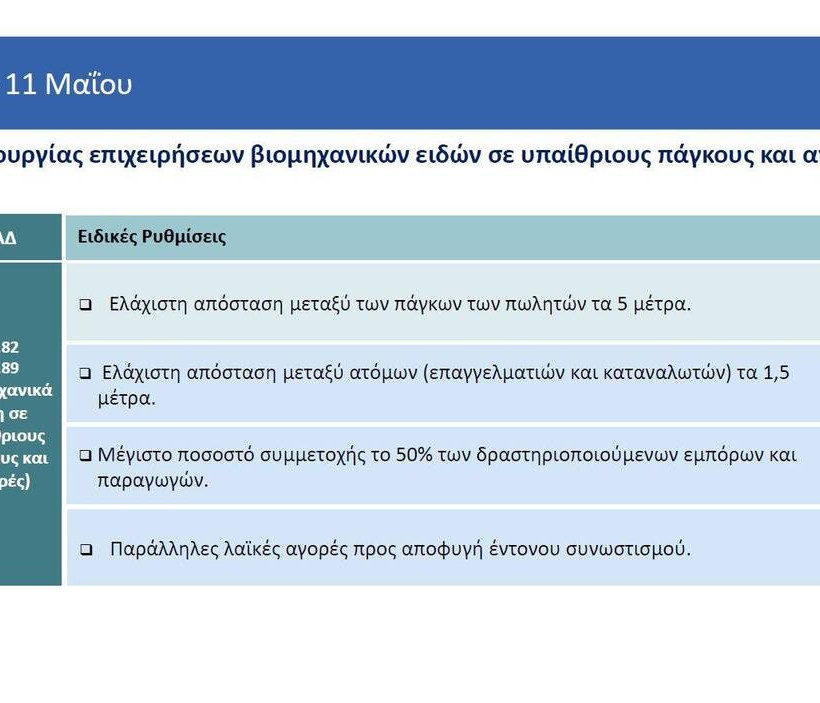 Τέλος, για τις επιχειρήσεις βιομηχανικών ειδών σε υπαίθριους πάγκους και αγορές ισχύουν τα έξης:
