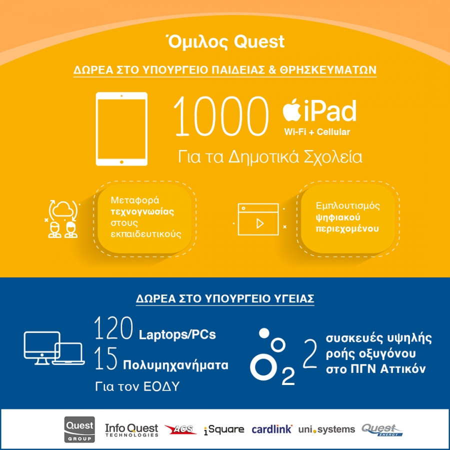 O Όμιλος Quest, έχοντας ενεργή παρουσία και συμβολή επί 40 περίπου χρόνια στον ψηφιακό μετασχηματισμό της ελληνικής κοινωνίας, ανακοινώνει τη Δωρεά σύγχρονου εξοπλισμού πληροφορικής συνολικής αξίας €500.000 στο Υπουργείο Παιδείας και Θρησκευμάτων και στο Υπουργείο Υγείας.
