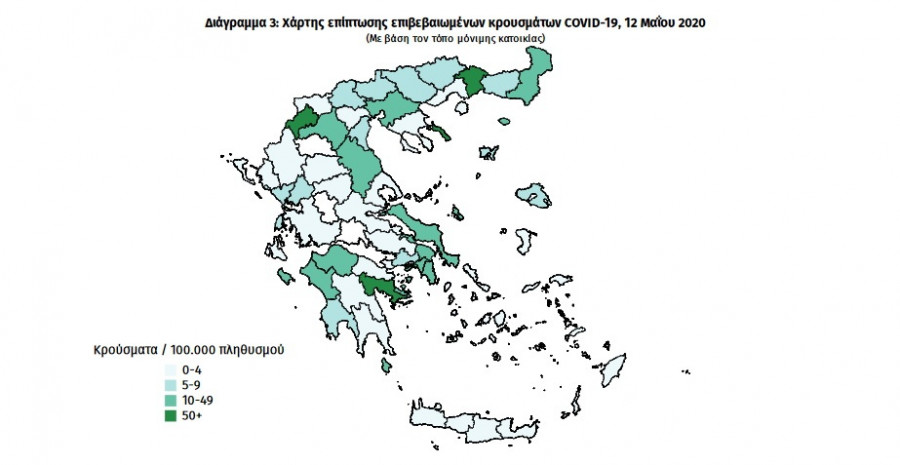 Οι τρεις νομοί, στους οποίους δεν εντοπίστηκε η εντοπίστηκαν μετρημένα κρούσματα, είναι η Ευρυτανία, η Φωκίδα και τα Γρεβενά, όπως φαίνεται και στον χάρτη που ακολουθεί: