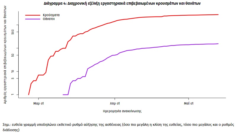 Η διαχρονική εξέλιξη των συνολικών κρουσμάτων και συνολικού αριθμού των θανάτων ασθενών COVID-19 παρουσιάζεται στο ακόλουθο διάγραμμα (σε λογαριθμική κλίμακα).