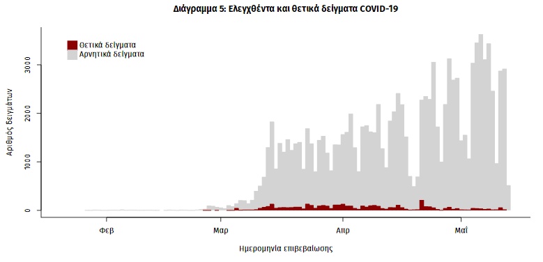 Από την 1η Ιανουαρίου 2020 μέχρι σήμερα, στα εργαστήρια που διενεργούν ελέγχους για τον νέο κορωνοϊό (SARS-CoV-2) και που δηλώνουν συστηματικά στον ΕΟΔΥ το σύνολο των δειγμάτων που ελέγχουν (θετικά και αρνητικά), έχουν συνολικά ελεγχθεί 112042 κλινικά δείγματα, εκ των οποίων τα 4179 (3.7%) ήταν θετικά στον κορωνοϊό (συμπεριλαμβάνονται και περισσότερα από ένα δείγματα ανά άτομο που ελέγχθηκε).