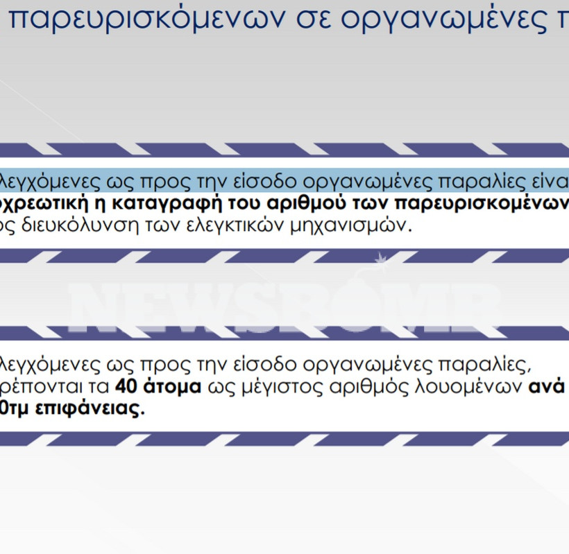 - Σε ελεγχόμενες ως προς την είσοδο οργανωμένες παραλίες, ο μέγιστος αριθμός λουομένων είναι τα 40 άτομα ανά 1.000τ.μ.