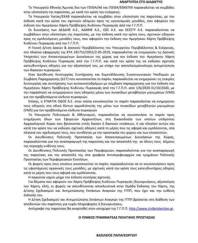 Φωτιές στην Ελλάδα - Όλες οι ειδήσεις: Η Γενική Γραμματεία Πολιτικής Προστασίας στο πλαίσιο της τρέχουσας αντιπυρικής περιόδου ανακοινώνει την καθημερινή έκδοση του Ημερήσιου Χάρτη Πρόβλεψης Κινδύνου Πυρκαγιάς για τη φετινή αντιπυρική περίοδο και συγκεκριμένα για το διάστημα από την 1η Ιουνίου έως την 31η Οκτωβρίου 2020.