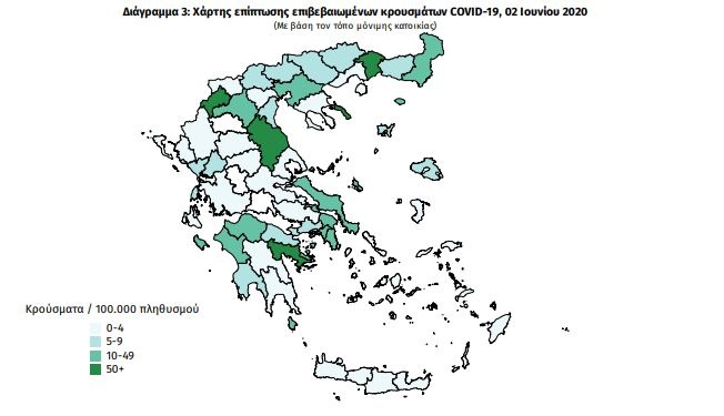 Τα νέα εργαστηριακά επιβεβαιωμένα κρούσματα της νόσου την Τρίτη (02/06) είναι 19, εκ των οποίων 12 σε ταξιδιώτες που αφίχθηκαν με πτήση από το εξωτερικό. Ο συνολικός αριθμός των κρουσμάτων ανέρχεται σε 2.937 (ημερήσια μεταβολή +0.7%), εκ των οποίων 55.3% άνδρες.