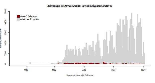 Δείγματα που έχουν ελεγχθεί στα συνεργαζόμενα με τον ΕΟΔΥ εργαστήρια: Από την 1η Ιανουαρίου 2020 μέχρι σήμερα, στα εργαστήρια που διενεργούν ελέγχους για τον νέο κορωνοϊό (SARS-CoV-2) και που δηλώνουν συστηματικά στον ΕΟΔΥ το σύνολο των δειγμάτων που ελέγχουν (θετικά και αρνητικά), έχουν συνολικά ελεγχθεί 185.590 κλινικά δείγματα, εκ των οποίων τα 4825 (2.6%) ήταν θετικά στον κορωνοϊό (συμπεριλαμβάνονται και περισσότερα από ένα δείγματα ανά άτομο που ελέγχθηκε).