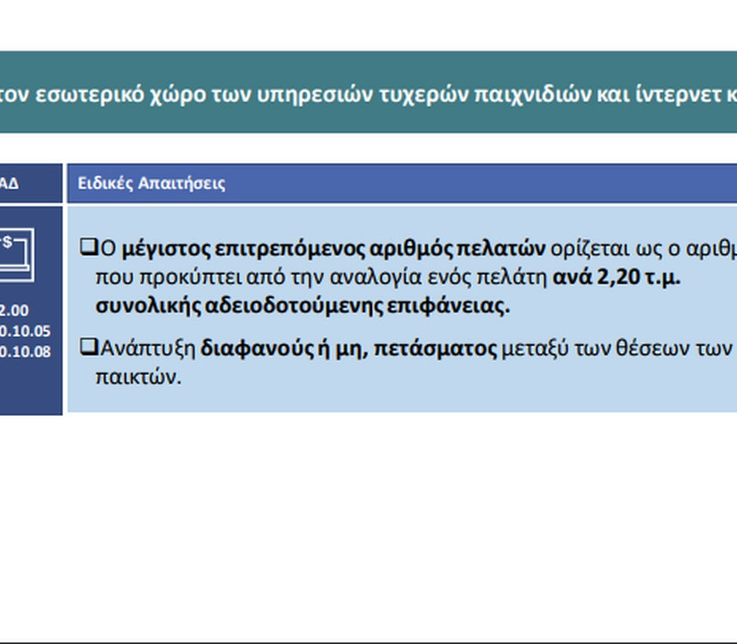 Για τις υπηρεσίες τυχερών παιχνιδιών και ίντερνετ καφέ ισχύει, η σχέση ατόμων όπως ορίζεται για τον εσωτερικό χώρο της εστίασης δηλαδή ένας πελάτης ανά 2,2τμ και επιπροσθέτως θα πρέπει να τοποθετείται πέτασμα μεταξύ των θέσεων των παικτών.