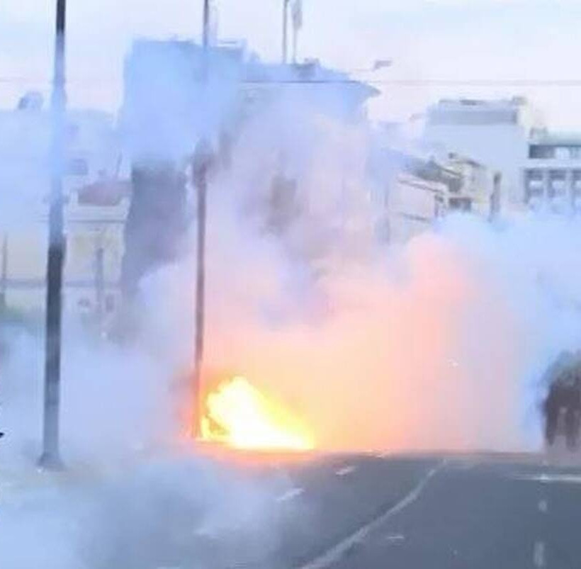 Διαδηλωτές πέταξαν μολότοφ, πέτρες και μπουκάλια κατά της διμοιρίας ΜΑΤ που βρισκόταν μπροστά από την πρεσβεία ενώ έβαλαν και φωτιά σε κάδους απορριμάτων.