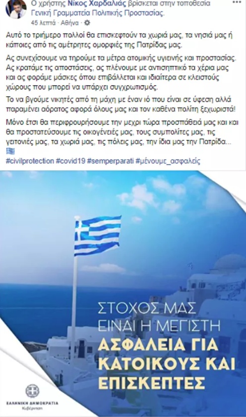 «Ας συνεχίσουμε να τηρούμε τα μέτρα ατομικής υγιεινής και προστασίας. Ας κρατάμε τις αποστάσεις, ας πλένουμε με αντισηπτικό τα χέρια μας και ας φοράμε μάσκες όπου επιβάλλεται και ιδιαίτερα σε κλειστούς χώρους που μπορεί να υπάρχει συγχρωτισμός» σημείωσε ο Νίκος Χαρδαλιάς.