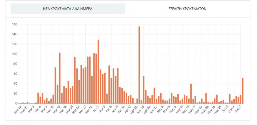 Σύμφωνα με το https://covid19.gov.gr/ το τελευταίο 24ωρο έχουν καταγραφεί 52 νέα κρούσματα, ανεβάζοντας τον συνολικό αριθμό στην χώρα μας σε 3.049.