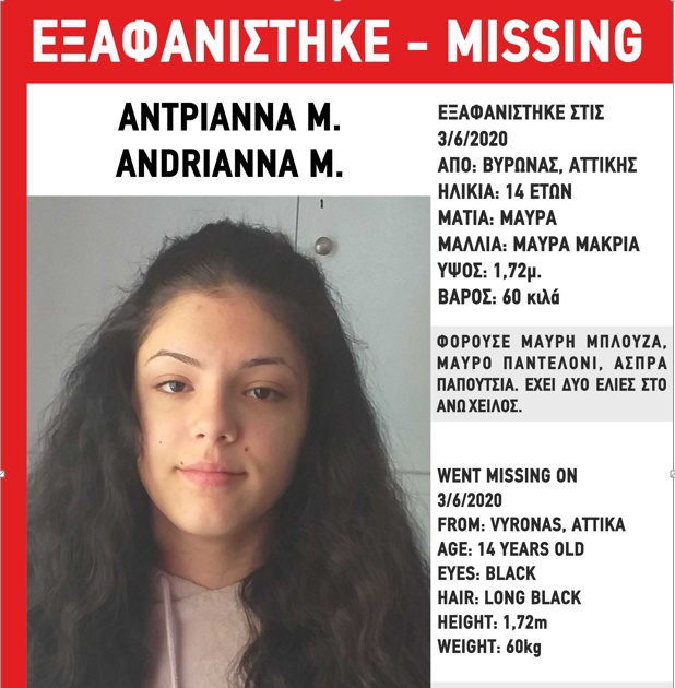 Εξαφανίστηκε το πρωί της Τετάρτης (03/06) από την περιοχή του Βύρωνα Αττικής, η Αντριάννα Μ., 14 ετών.
