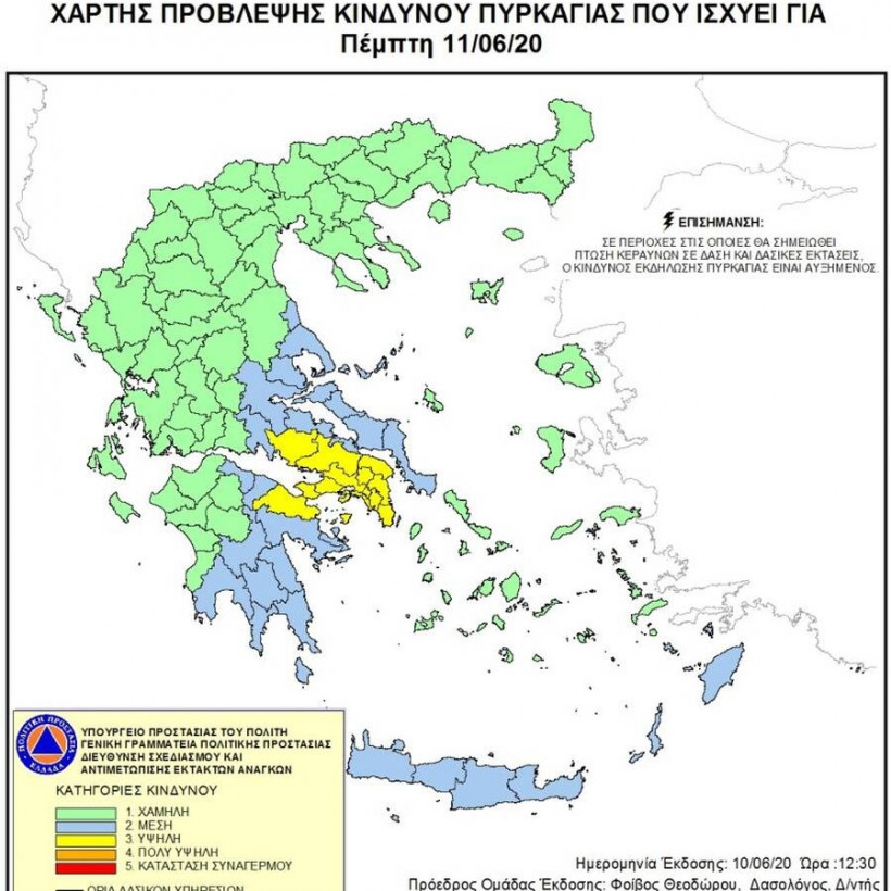 Φωτιές στην Ελλάδα - Όλες οι ειδήσεις: Σύμφωνα με το Χάρτη Πρόβλεψης Κινδύνου Πυρκαγιάς που εκδίδει η Γενική Γραμματεία Πολιτικής Προστασίας του Υπουργείου Εσωτερικών και Διοικητικής Ανασυγκρότησης, για σήμερα Πέμπτη, 11 Ιουνίου, προβλέπεται υψηλός κίνδυνος πυρκαγιάς (κατηγορία κινδύνου 3), σε ορισμένες περιοχές της Ελλάδας.