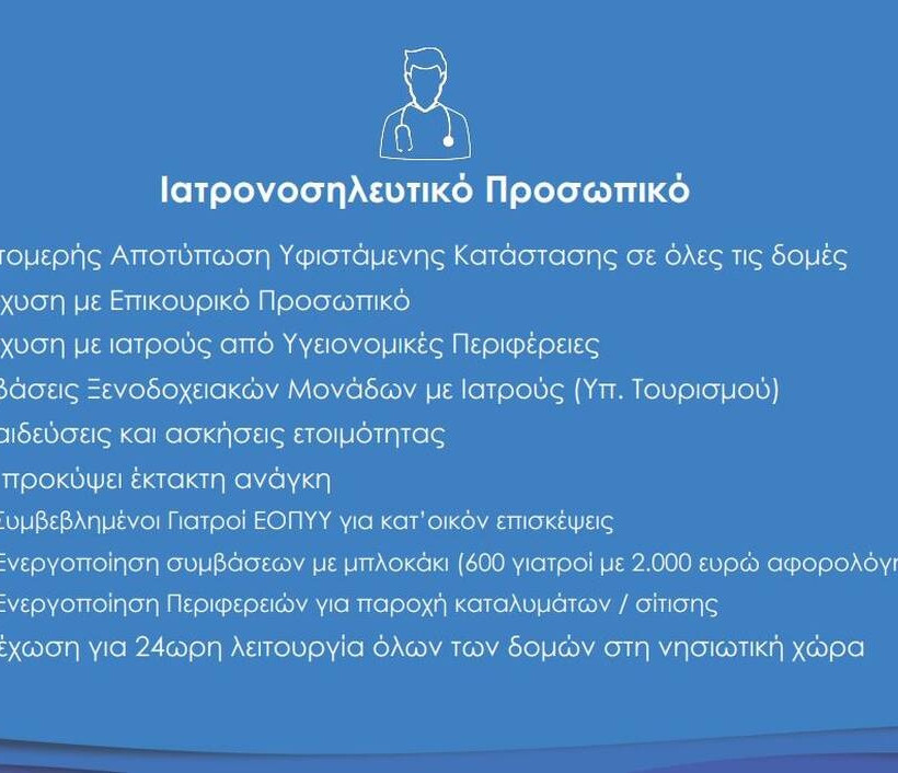 Όσον αφορά το ιατρονοσηλευτικό προσωπικό, ανακοίνωσε την ενίσχυση της Υγείας με επικουρικό προσωπικό, ενίσχυση με γιατρούς από Υγειονομικές Περιφέρειες, συμβάσεις ξενοδοχειακών μονάδων με ιατρούς, εκπαιδεύσεις και ασκήσεις ετοιμότητας.