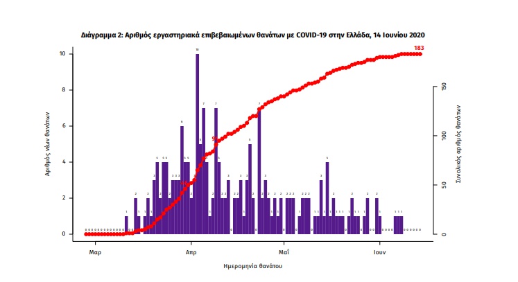 Δεν έχει καταγραφεί κανένας νέος θάνατος ασθενούς με COVID-19 το τελευταίο 24ωρο, ενώ από την έναρξη της επιδημίας έχουν καταγραφεί συνολικά 183 θάνατοι. Η μέση ηλικία των ασθενών που απεβίωσαν είναι 76 έτη.