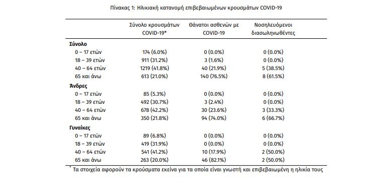 Από το σύνολο των 3121 κρουσμάτων, 694 (22.2%) θεωρούνται σχετιζόμενα με ταξίδι από το εξωτερικό, 1775 (56.9%) είναι σχετιζόμενα με ήδη γνωστό κρούσμα και τα υπόλοιπα δεν σχετίζονται ούτε με ταξίδι ούτε με άλλο γνωστό κρούσμα ή είναι ακόμα υπό διερεύνηση. Η μέση ηλικία των κρουσμάτων είναι 47 έτη (εύρος 0 έως 102 ετών), ενώ η μέση ηλικία των θανάτων είναι 76 έτη (εύρος 35 έως 102 ετών). Η ηλικιακή κατανομή των (α) συνολικών κρουσμάτων, (β) των περιστατικών που κατέληξαν σε θάνατο και (γ) των ασθενών που νοσηλεύονται διασωληνωμένοι, είναι η ακόλουθη: