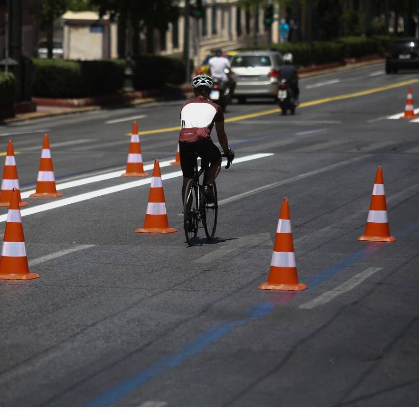 Δίπλα σε αυτόν, εκεί που περνούν οι γραμμές του τραμ, δημιουργήθηκε μια προσωρινή διαδρομή για ποδήλατο, σε κίτρινο χρώμα με αντανακλαστικές και αντιολισθητικές βαφές.