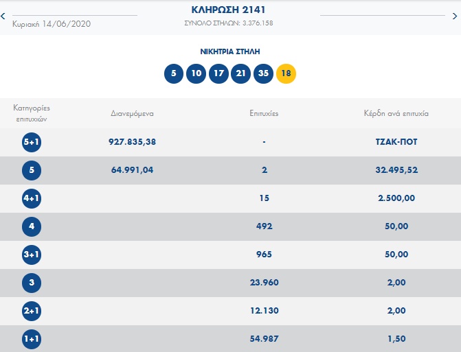 Υπενθυμίζεται ότι οι αριθμοί που ανέδειξε η κληρωτίδα της κλήρωσης της Κυριακής (14/6) είναι οι: 5, 10, 17, 21, 35 και Τζόκερ: 18.