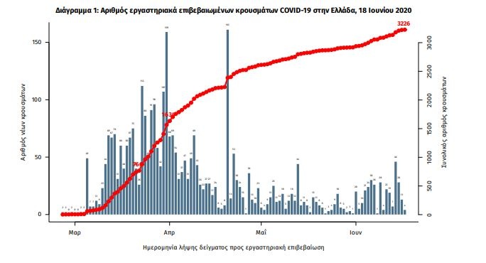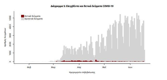 Δείγματα που έχουν ελεγχθεί στα συνεργαζόμενα με τον ΕΟΔΥ εργαστήρια: Από την 1η Ιανουαρίου 2020 μέχρι σήμερα, στα εργαστήρια που διενεργούν ελέγχους για τον νέο κορονοϊό (SARS-CoV-2) και που δηλώνουν συστηματικά στον ΕΟΔΥ το σύνολο των δειγμάτων που ελέγχουν (θετικά και αρνητικά), έχουν συνολικά ελεγχθεί 270.338 κλινικά δείγματα, εκ των οποίων τα 5.249 (1.9%) ήταν θετικά στον κορονοϊό (συμπεριλαμβάνονται και περισσότερα από ένα δείγματα ανά άτομο που ελέγχθηκε).