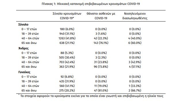 Η μέση ηλικία των κρουσμάτων είναι 48 έτη (εύρος 0 έως 102 ετών), ενώ η μέση ηλικία των θανάτων είναι 76 έτη (εύρος 35 έως 102 ετών). Η ηλικιακή κατανομή των (α) συνολικών κρουσμάτων, (β) των περιστατικών που κατέληξαν σε θάνατο και (γ) των ασθενών που νοσηλεύονται διασωληνωμένοι, είναι η ακόλουθη:
